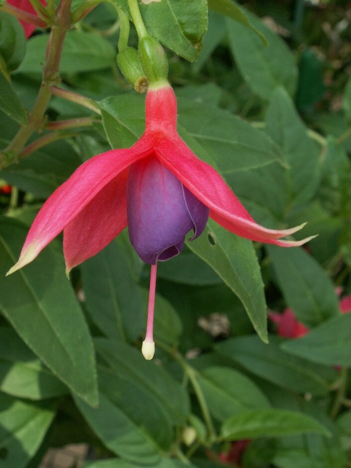 Fuchsia can be deciduous or evergreen shrubs or trees, rarely perennials, with opposite or whorled leaves and usually pendent flowers with conspicuous tubular calyx, 4 spreading sepals and 4 erect petals