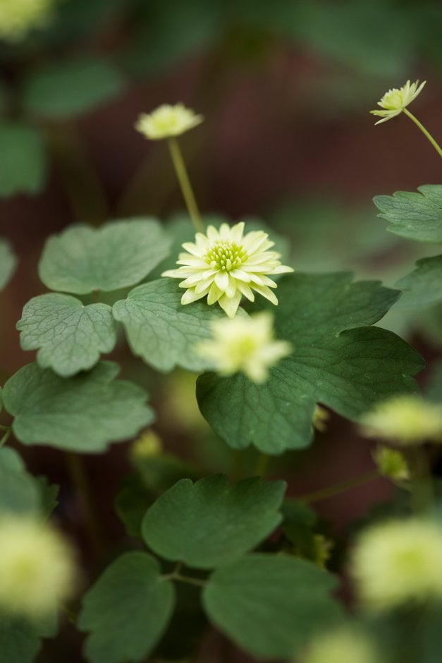 A tuberous, clump-forming perennial to about 10cm high, slowly spreading to 30cm across. Pale yellowish-green, double flowers are produced above the delicate, ferny foliage in spring and early summer