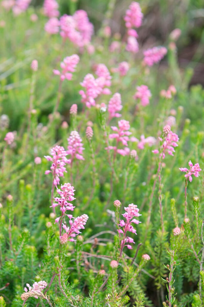 Erica can be prostrate or erect, evergreen shrubs with fine, needle-like leaves in whorls, and racemes or panicles of small, bell-shaped or tubular flowers
