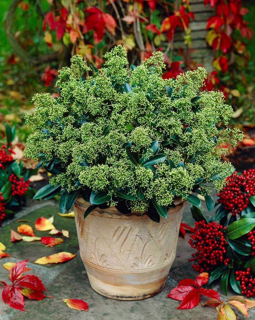 Skimmia are compact evergreen shrubs with simple, aromatic leaves and terminal panicles of small white or yellowish flowers followed, on fertilised female plants, by shiny red berries; most have male and female flowers on separate plants