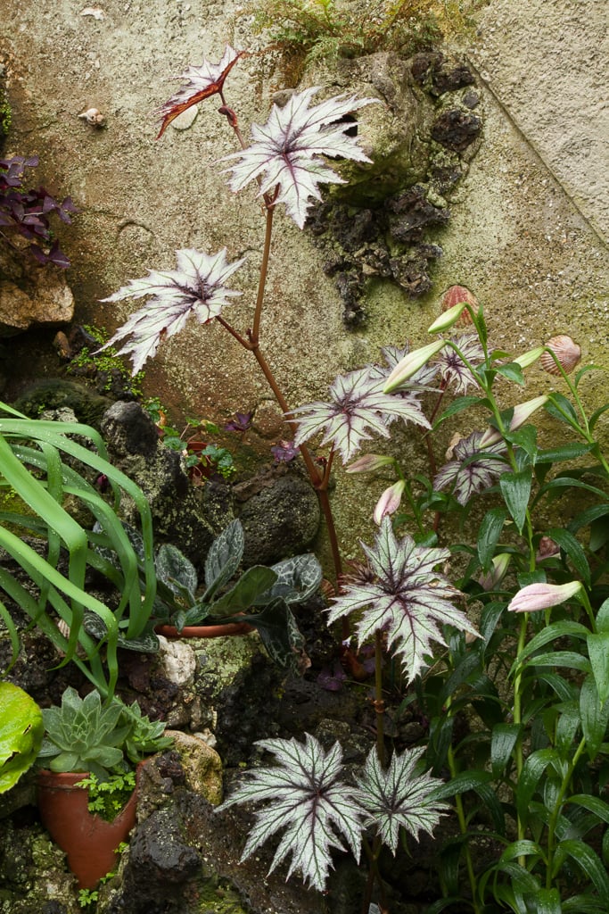 Begonia can be annuals, evergreen or deciduous perennials or shrubs, with fibrous, tuberous or rhizomatous roots and usually asymmetrical leaves, often strikingly patterned, and small or large flowers, both male and female in the same cluster