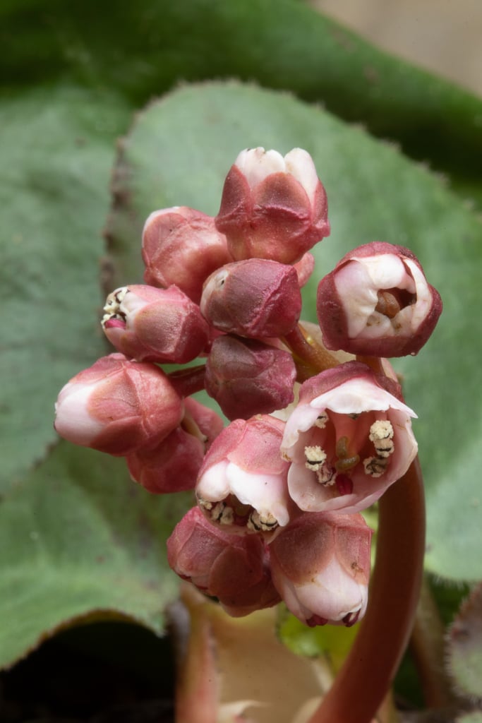 Bergenia are evergreen rhizomatous perennials with leathery, rounded leaves and dense, erect clusters of bell-shaped pink or white flowers in spring