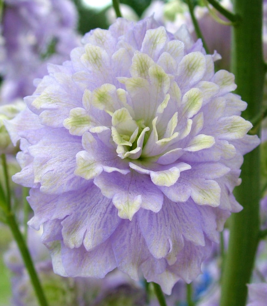 'Susan Edmunds' is a vigorous, branching, upright perennial to 238cm, with medium to small pale green leaves. Main spikes to 100cm long, with a few strong side spikes. Flowers fully double, to 5.5cm across, giving a frilled appearance, pale violet blue, inner petals with yellow-green stripes