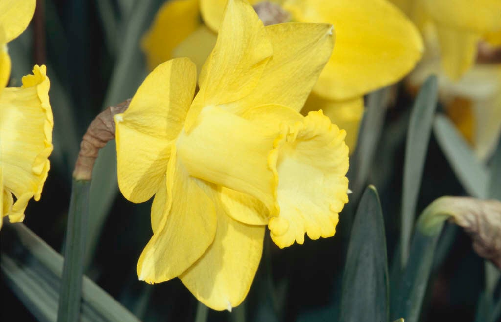 A robust trumpet daffodil to 50cm tall, with flowers to 12cm across in early and mid spring, the lemon-yellow perianth segments broadly ovate and overlapping, the trumpet white, with a widely flanged and notched rim