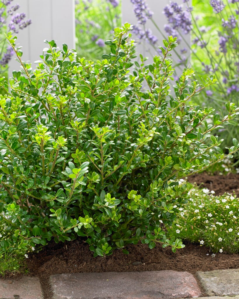A slow-growing evergreen shrub or tree to a height of up to 5m but often kept smaller used as an alternative to box for shaping into topiary balls. The leaves are tiny, glossy and dark green, and the flowers are white, appearing in late spring followed by black berries if there is a male Japanese holly present for pollination