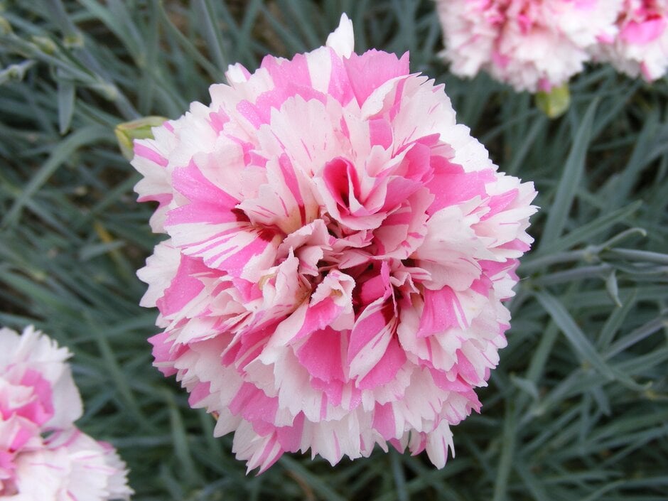 A compact, evergreen perennial bearing fragrant, double flowers on erect stems in summer; flowers have fringed petals which are pale pink to white with flecks and streaks of darker pink