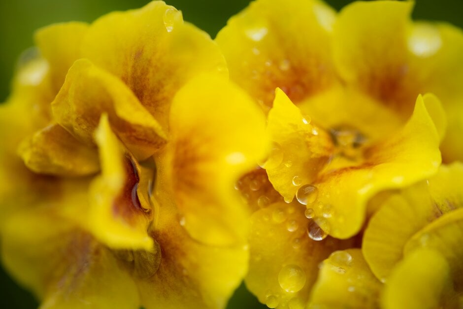 A compact, rosette-forming, evergreen perennial with pale green, toothed foliage, and fragrant, double, golden flowers with barely-visible reddish centres and red undersides, appearing in early to late spring