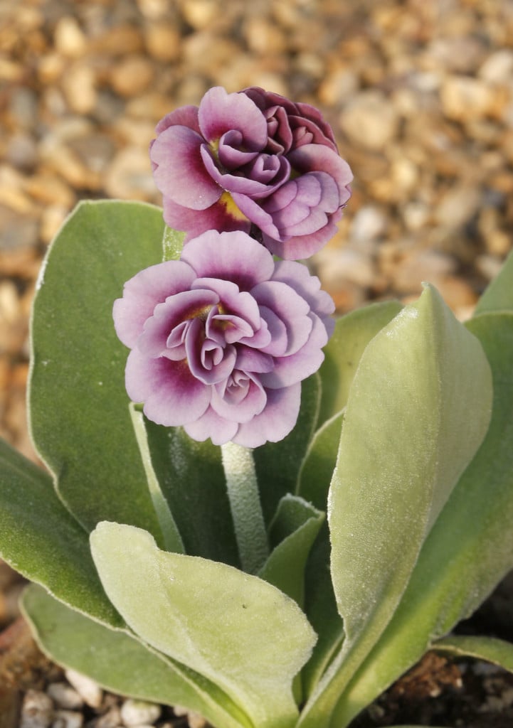 Auricula section primulas are evergreen perennials with leathery, often farinose foliage and simple umbels of salver-shaped flowers which are usually pink, purple or yellow