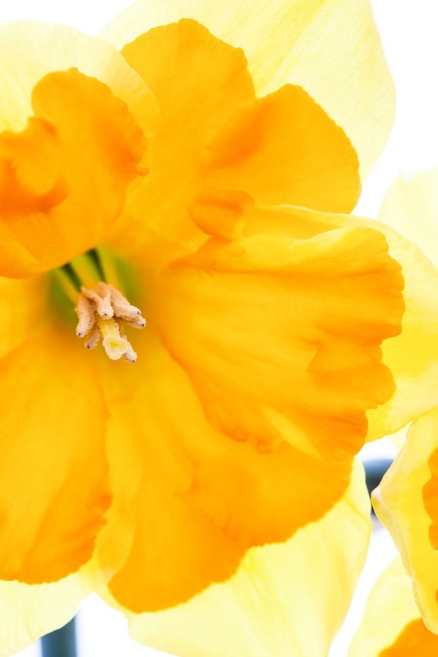 A collar-type, split corona daffodil flowering mid- to late spring. Blooms to 8cm across comprise rich yellow outer perianth segments overlain by the frilled and ribbed segments of the split corona that are predominantly orange in colour with some yellow markings towards their base