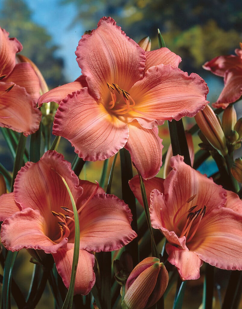 Hemerocallis may be evergreen or herbaceous perennials, with narrow, strap-shaped leaves and funnel-shaped flowers on erect stems in late spring or early summer