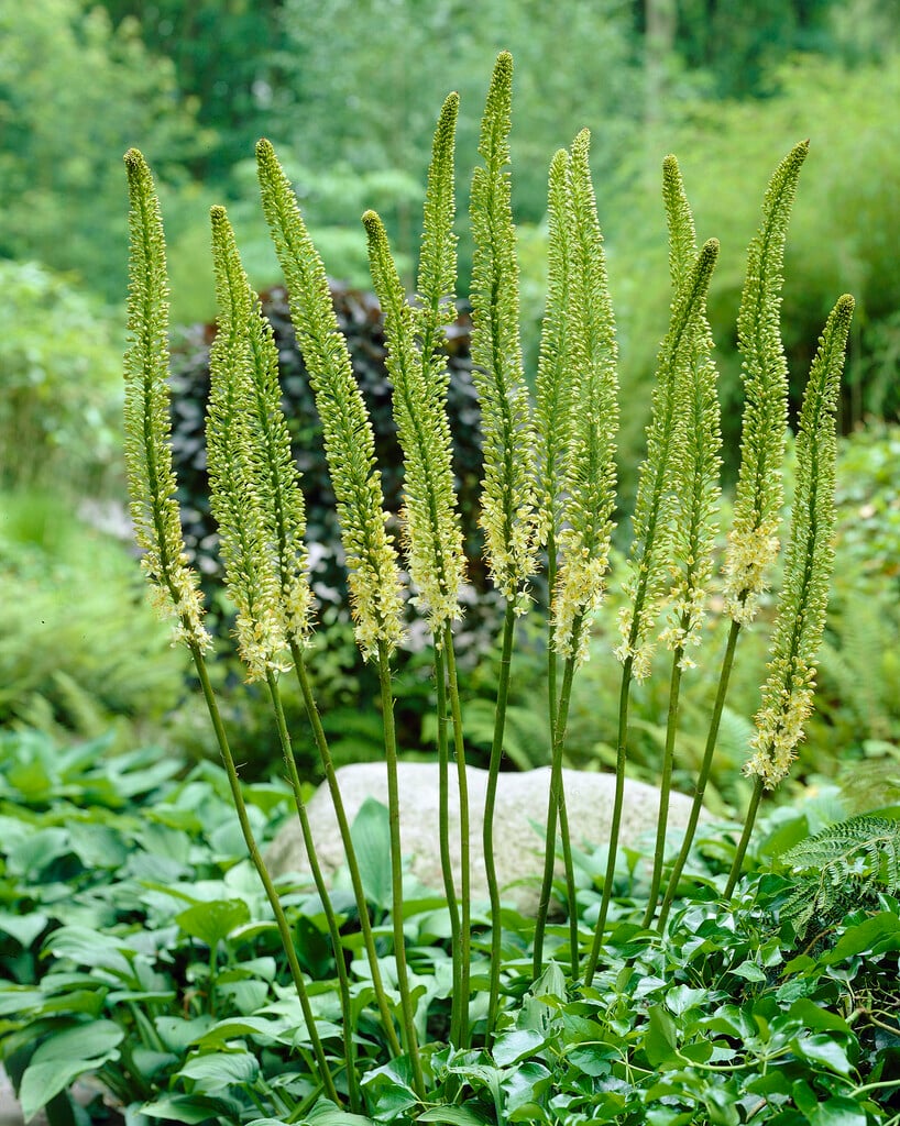 A clump-forming perennial, to 1.2m high in flower, with fleshy roots and narrowly lance-shaped, mid green leaves that die back after flowering. Tall spikes of small, densely packed yellow flowers open from greenish buds in early summer