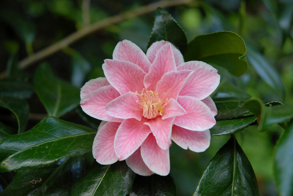 Camellia are evergreen shrubs with simple, ovate, glossy, leathery leaves and showy flowers with solitary or clustered flowers early in the year