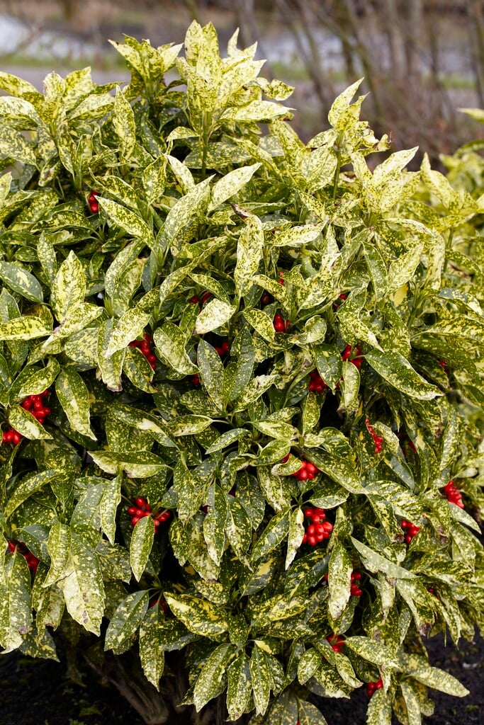 Aucuba are dioecious evergreen shrubs with simple, leathery leaves, attractively variegated in many cultivars, and small purple flowers followed on female plants by large glossy red fruit