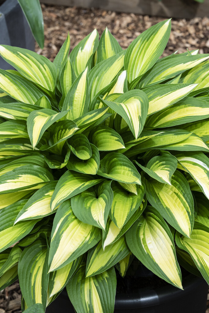Hosta are clump-forming herbaceous perennials with simple, ovate or lance-shaped leaves, often attractively coloured or variegated, and erect racemes of nodding, funnel or bell-shaped flowers in early summer