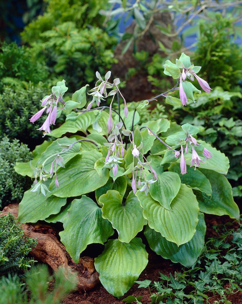 Hosta are clump-forming herbaceous perennials with simple, ovate or lance-shaped leaves, often attractively coloured or variegated, and erect racemes of nodding, funnel or bell-shaped flowers in early summer