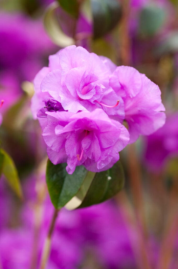 Rhododendron can be evergreen or deciduous shrubs or trees, with simple leaves, sometimes with a dense colourful indumentum of hairs on the lower side, and funnel-shaped, bell-shaped or tubular flowers that may be solitary or in short racemes