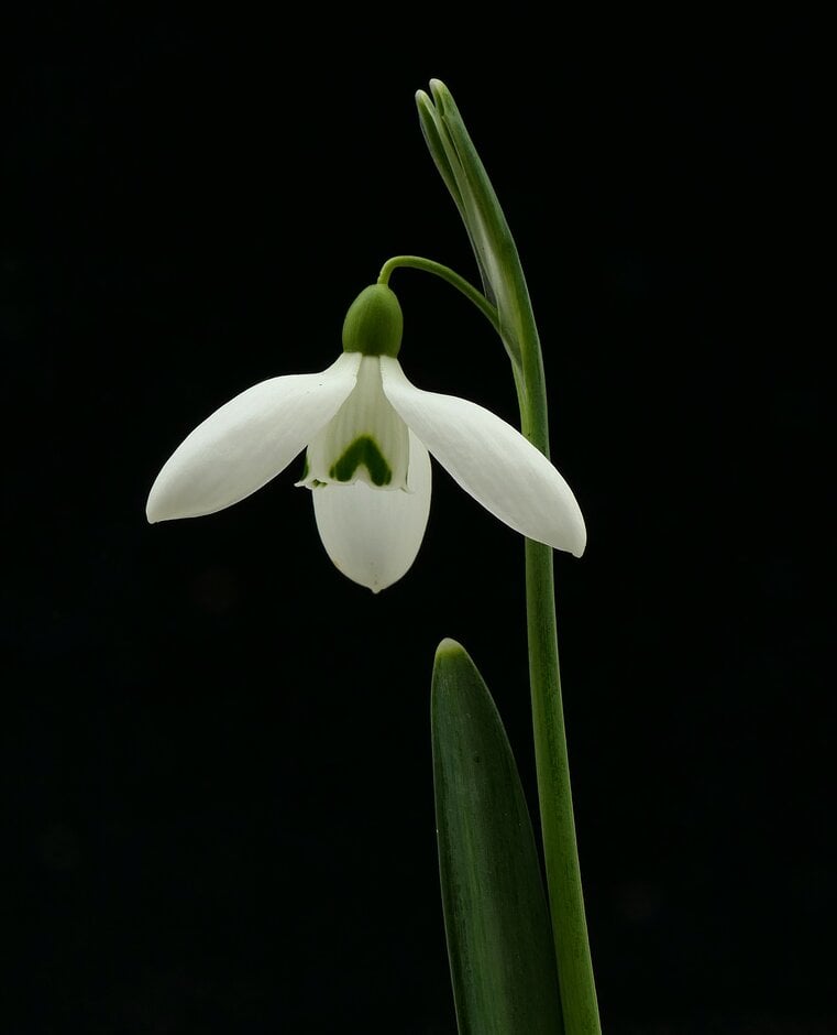 Galanthus are dwarf bulbous perennials with linear or strap-shaped leaves, and solitary, often honey-scented, nodding flowers with 3 white outer tepals and 3 smaller inner ones often marked with green