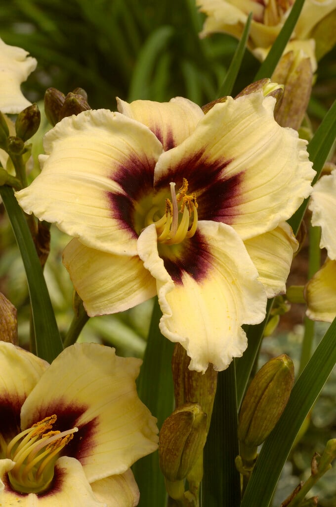 A deciduous herbaceous perennial that reaches approximately 61cm in height. It forms clumps of arching strap-shaped green leaves and near-white flowers with a dark purple eyezone and a green throat to 9cm across in summer