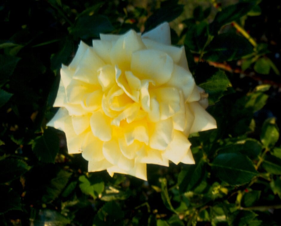 Vigorous, bushy rose about 1.2m tall, with glossy dark green leaves, and bearing lightly scented, fully double, yellow blooms fading to white at the edges, repeat-flowering through summer to autumn