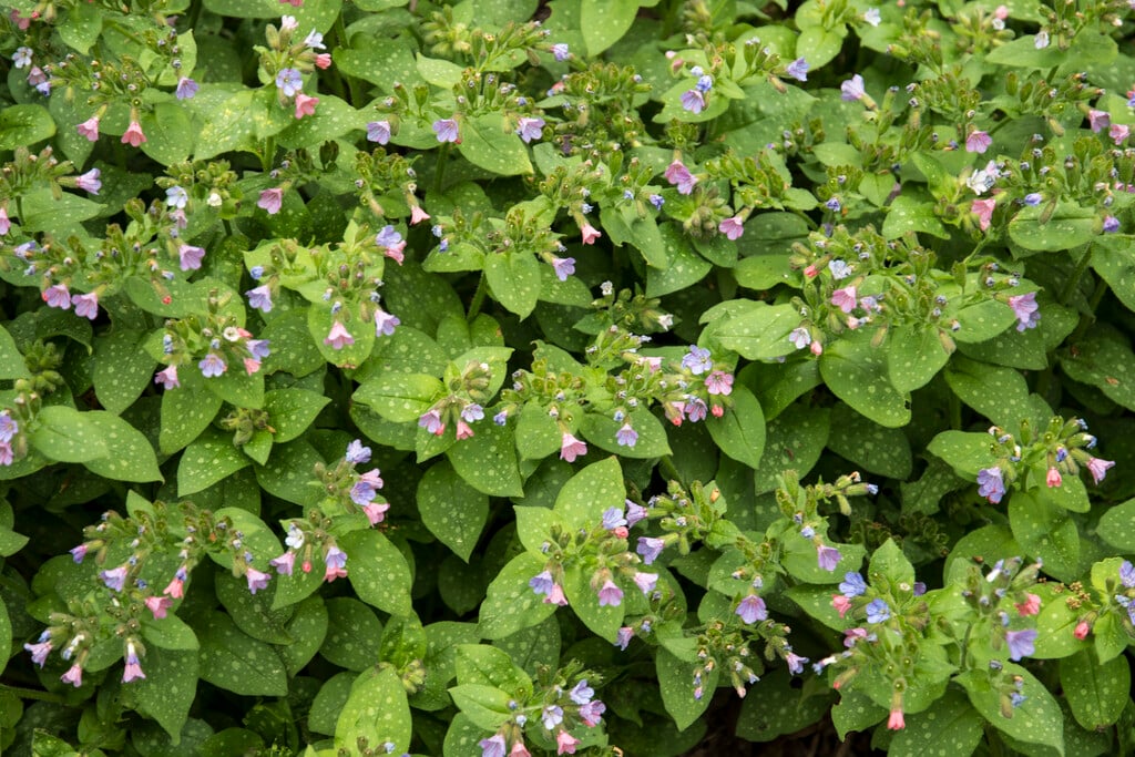 Pulmonaria can be herbaceous or semi-evergreen rhizomatous perennials with terminal clusters of funnel-shaped flowers in late winter or early spring, and often strikingly patterned leaves developing in summer