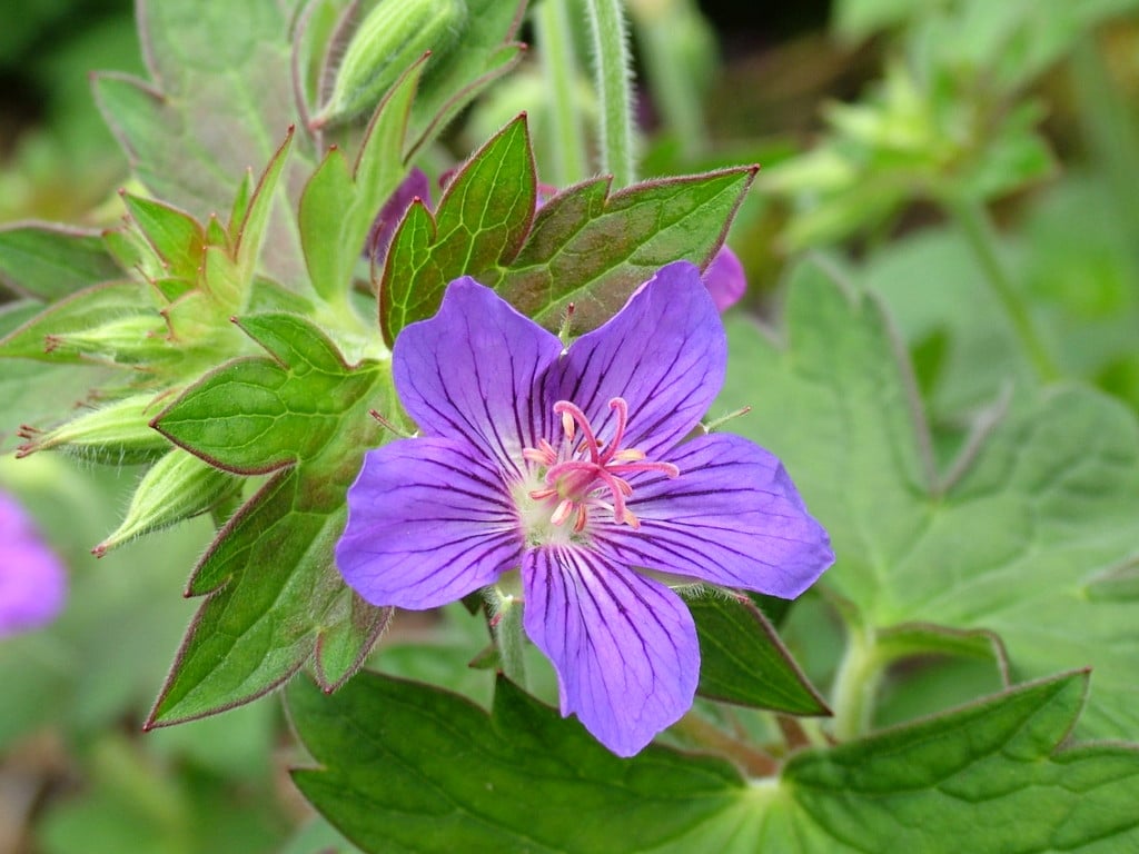 Geranium can be annuals, biennials and perennials, herbaceous or evergreen, with rounded, usually palmately lobed or divided leaves, and lax inflorescences of rounded, 5-petalled flowers