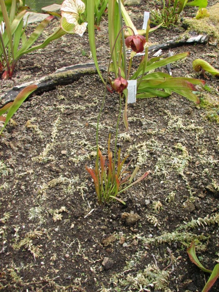A small carnivorous plant producing thin, green pitchers which are variably red-veined.The pitchers are25-45cm tall and around 2cm across at the mouth and are topped by small, overhanging hoods. Bright red, scented flowers are borne in spring