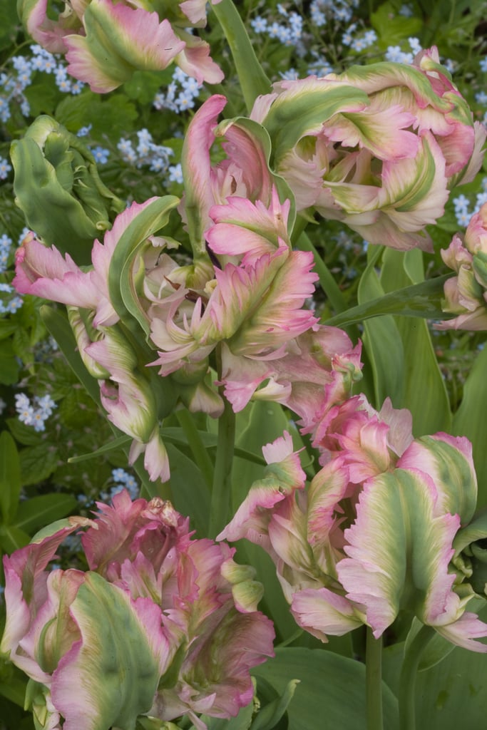 A perennial bulb with pale green, broadly lance-shaped leaves. This Parrot Group tulip has cup-shaped flowers, and heavily fringed petals with a strong green midrib, and creamy white and lilac pink margins. Flowers are approximately 55cm high, and produced in late spring