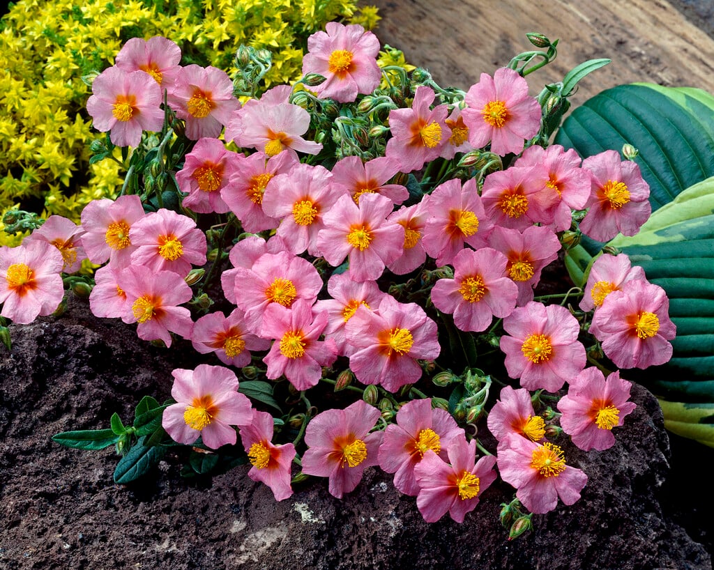 Helianthemum are bushy or spreading evergreen shrubs with small paired leaves and saucer-shaped flowers borne in short racemes in spring and early summer