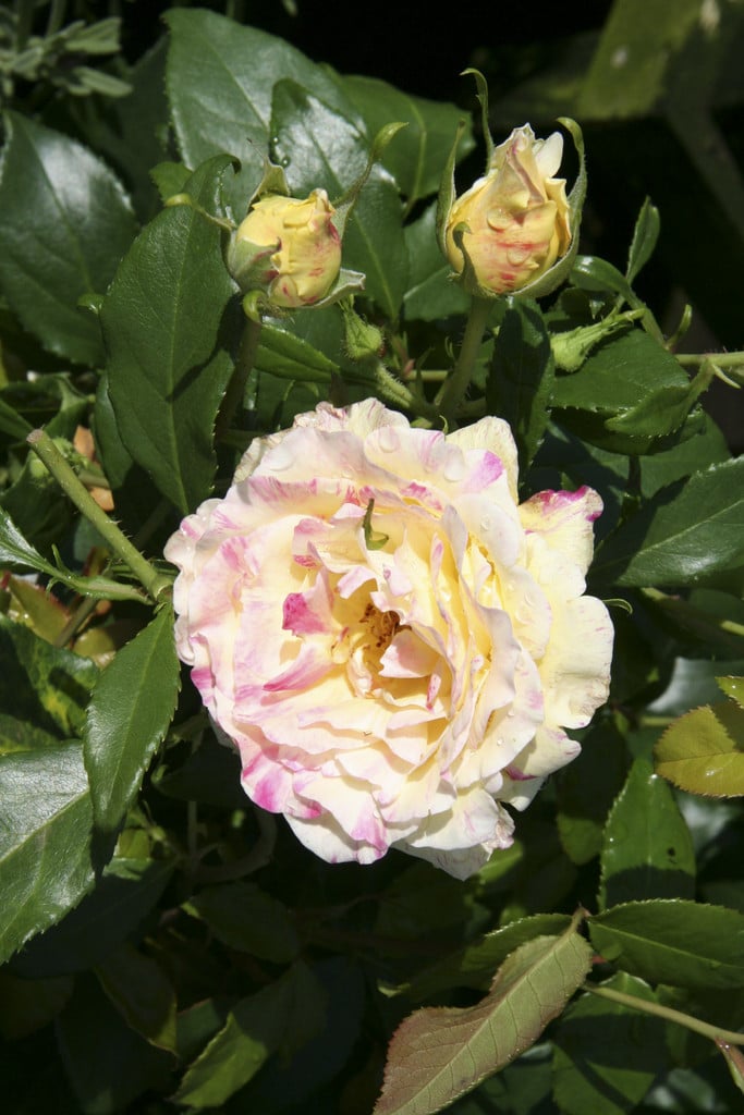 An upright, deciduous rose, to 1.2m tall, with glossy, dark green foliage and, from summer into autumn, clusters of lightly-scented, double, yellow and red-striped flowers that fade to cream and pink
