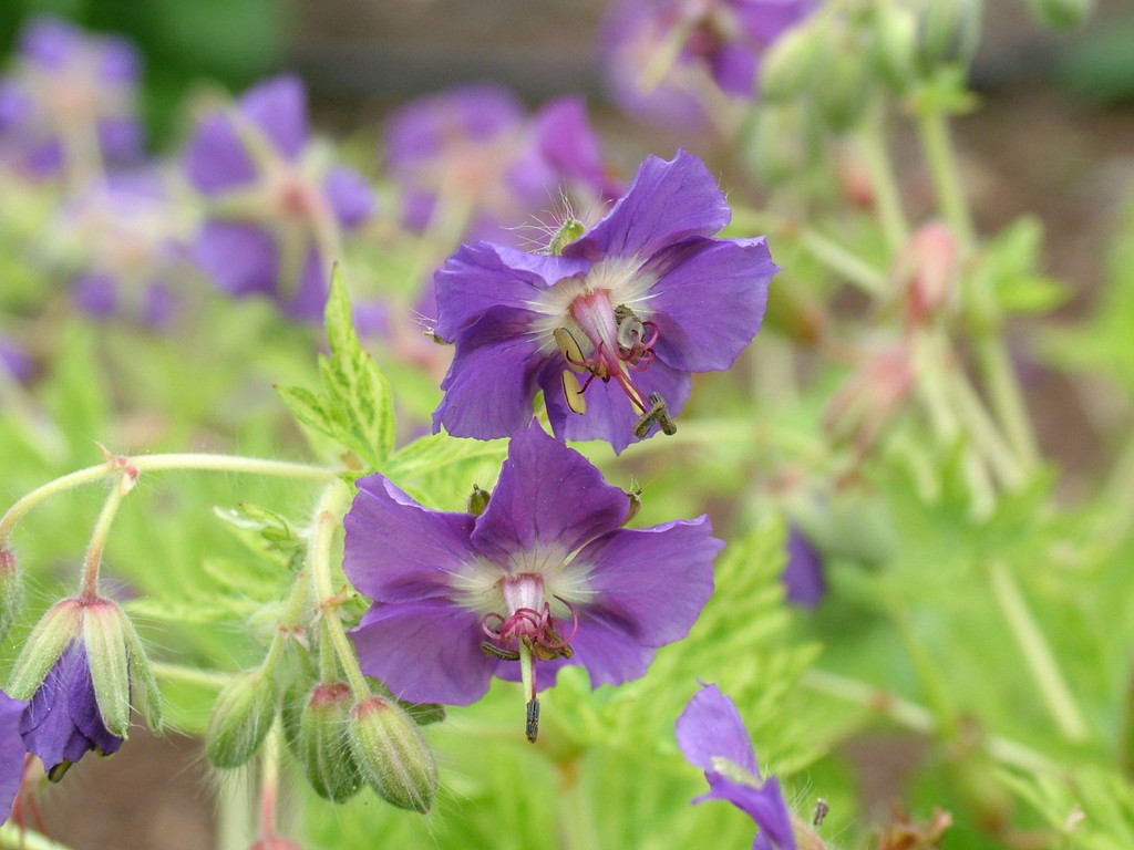 Geranium can be annuals, biennials and perennials, herbaceous or evergreen, with rounded, usually palmately lobed or divided leaves, and lax inflorescences of rounded, 5-petalled flowers