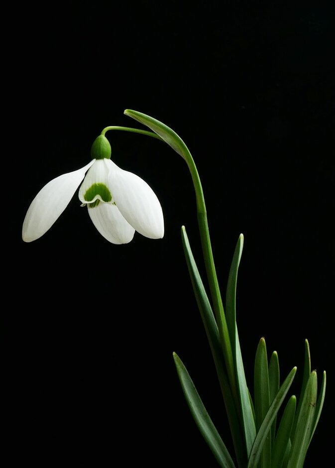 Galanthus are dwarf bulbous perennials with linear or strap-shaped leaves, and solitary, often honey-scented, nodding flowers with 3 white outer tepals and 3 smaller inner ones often marked with green