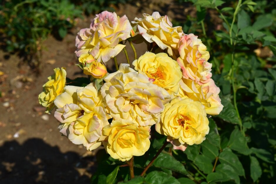 Extremely free-flowering, compact rose about 90cm tall, with large, matt dark green leaves, and bearing urn-shaped buds opening to large clusters of fragrant, fully double, high-centred yellow blooms flecked with pink, salmon and scarlet, repeat-flowering through summer to autumn