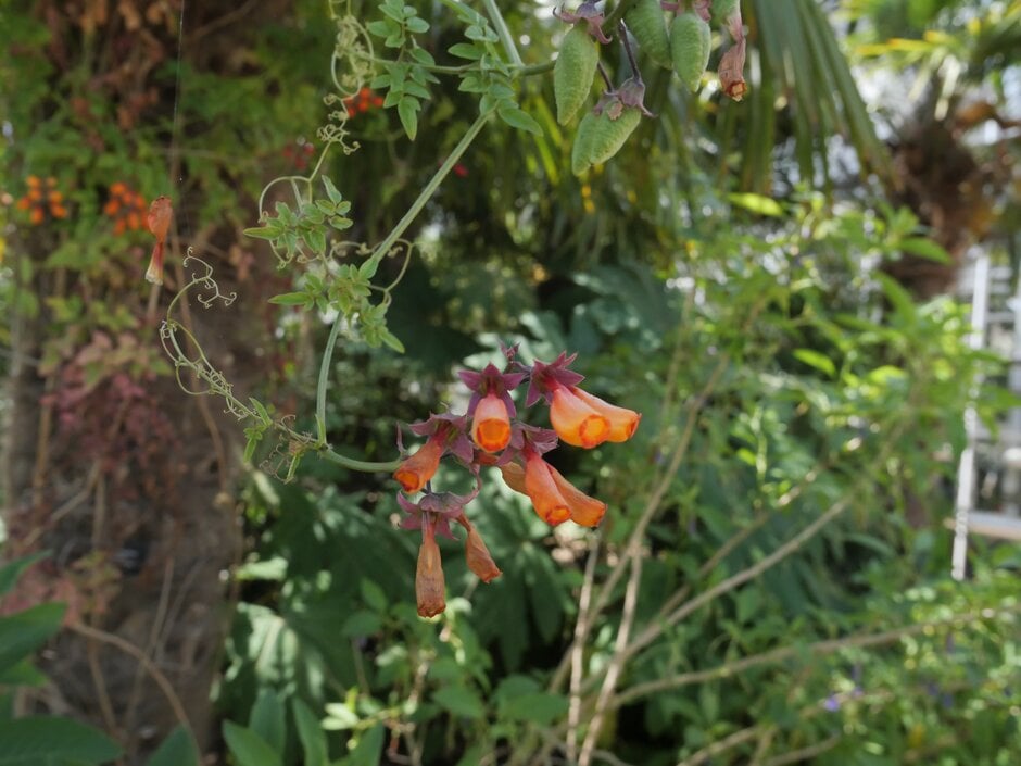 A slender, fast-growing, evergreen climber, often grown as an annual. Clinging by tendrils, it has pinnate leaves and clusters of tubular orangey-red flowers, 2.5cm long, from late spring to autumn