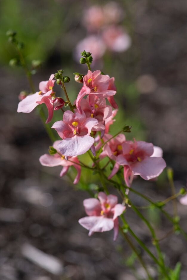 Diascia can be annuals or semi-evergreen perennials, usually making a mat of neat foliage with racemes of cup or bell-shaped flowers, usually in shades of pink, and each with two short spurs