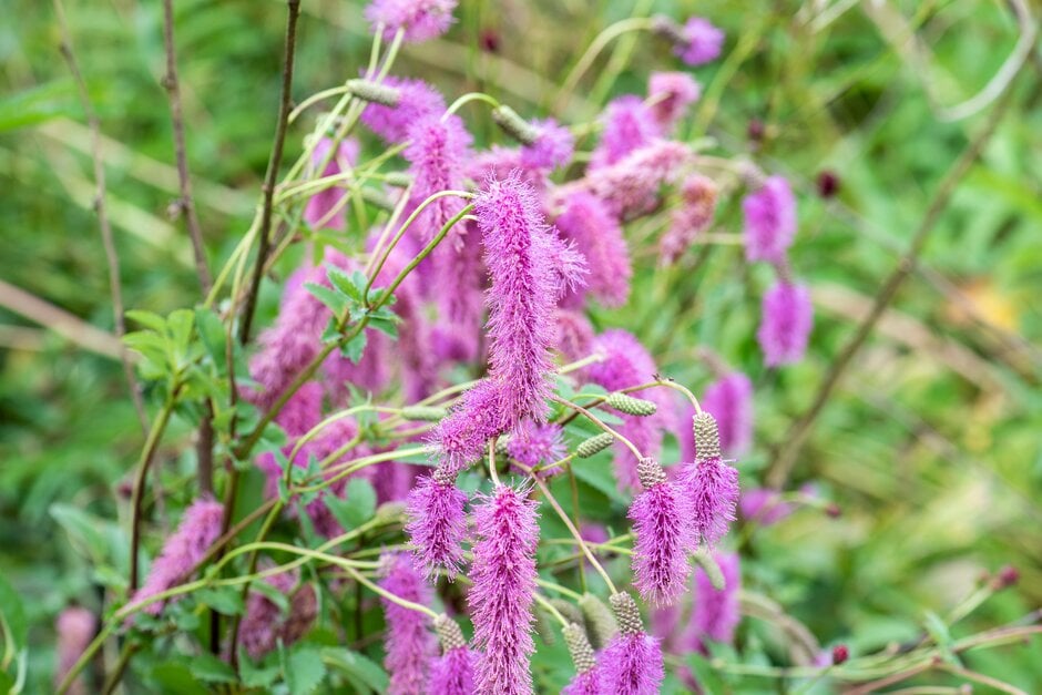 Sanguisorba are rhizomatous herbaceous perennials with attractive, pinnate leaves and branched stems bearing terminal spikes of small fluffy flowers with conspicuous stamens