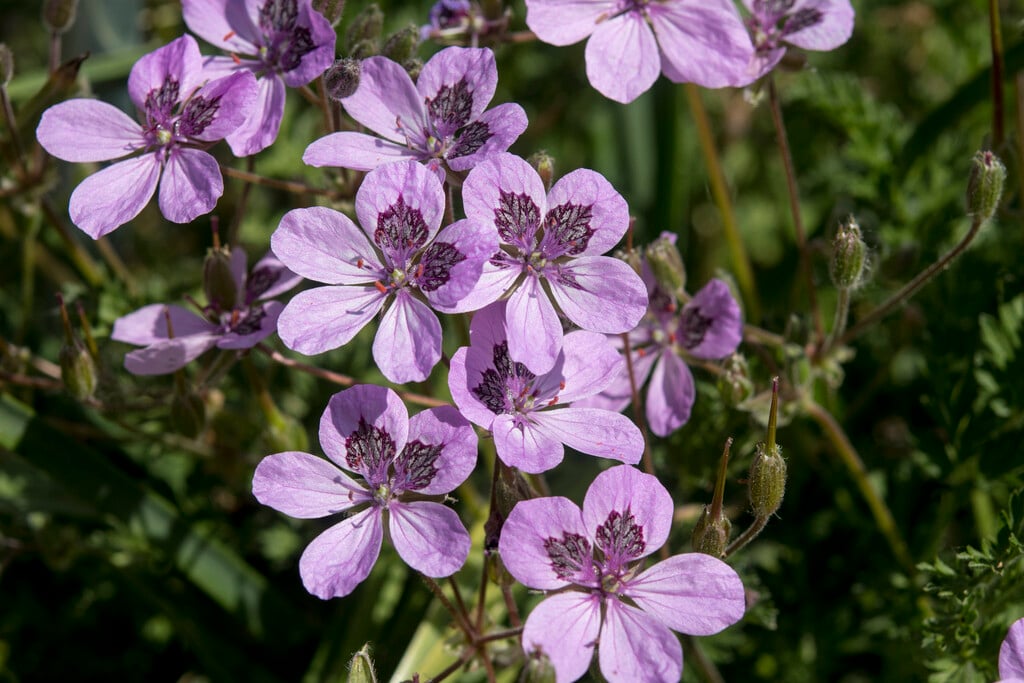 Erodium can be annuals, perennials or subshrubs, some evergreen, with lobed or pinnately divided leaves and bowl-shaped, 5-petalled flowers in summer