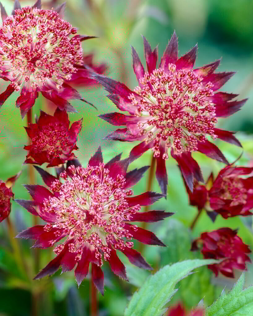 Astrantia are clump-forming herbaceous perennials with palmately lobed basal leaves and branched, erect, wiry stems bearing compact umbels of tiny flowers surrounded by a rosette of showy bracts
