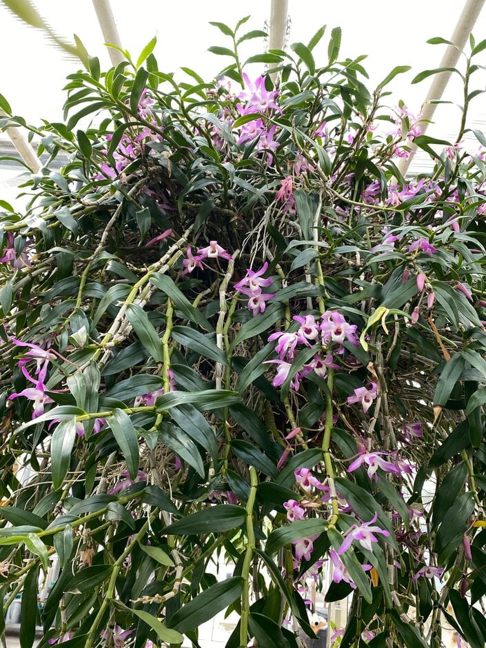 Dendrobium are epiphytic and terrestrial orchids with elongated, stem-like pseudobulbs bearing linear to ovate leaves. Racemes or panicles of showy flowers are produced from nodes along the stems mainly in spring