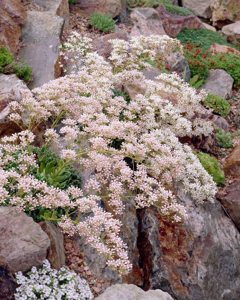 A compact evergreen alpine, forming a dense rosette up to 30cm across with layers of long, narrow, lime-encrusted leaves. Mature plants produce a large, arching flower spike to 60cm long, covered with small white flowers in late spring to early summer; plants die off after seeding