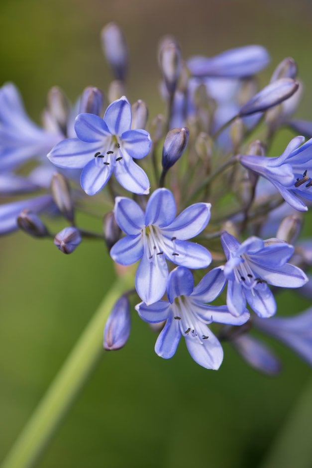 Agapanthus are clump-forming perennials with narrowly strap-shaped leaves, evergreen in some species, and erect stems bearing umbels of funnel-shaped blue or white flowers