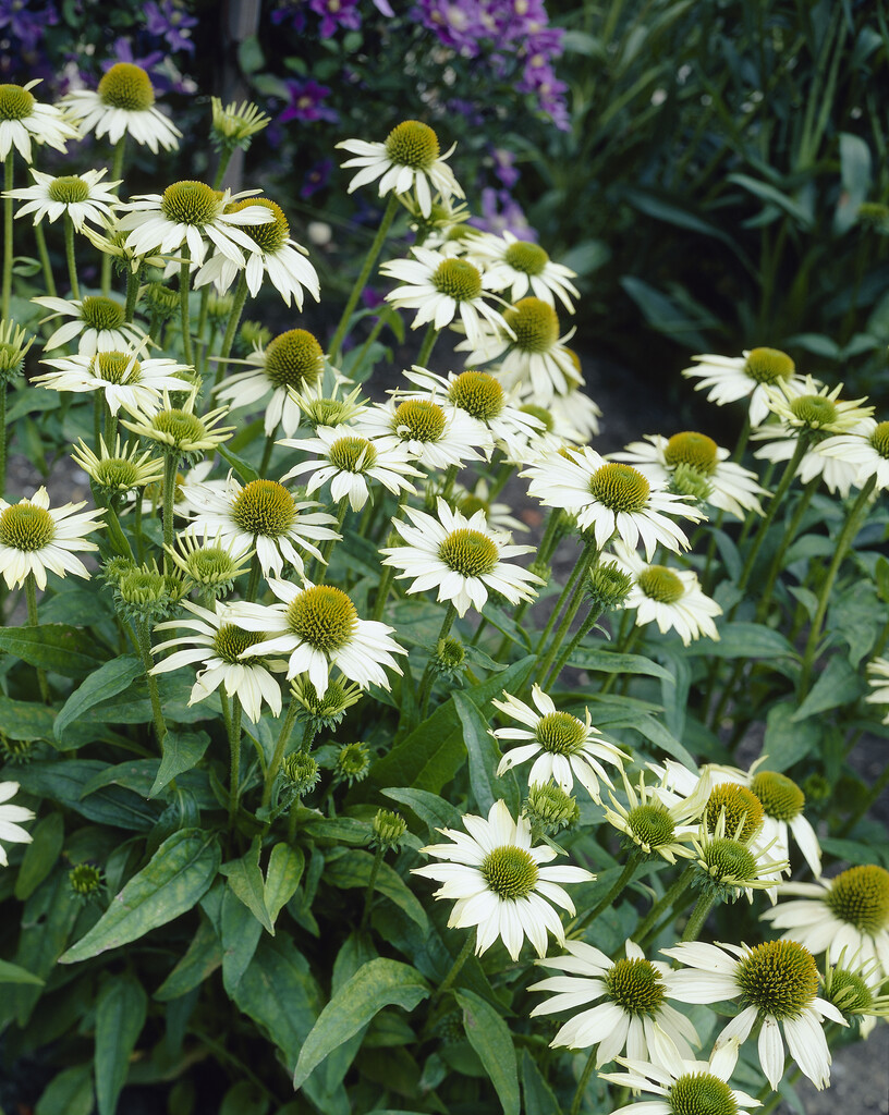 Compact, upright, perennial coneflower about 60cm in height, with narrowly pointed, pure white, star-like ray-petals surrounding a small, central yellowish-green cone, flowering from midsummer to autumn
