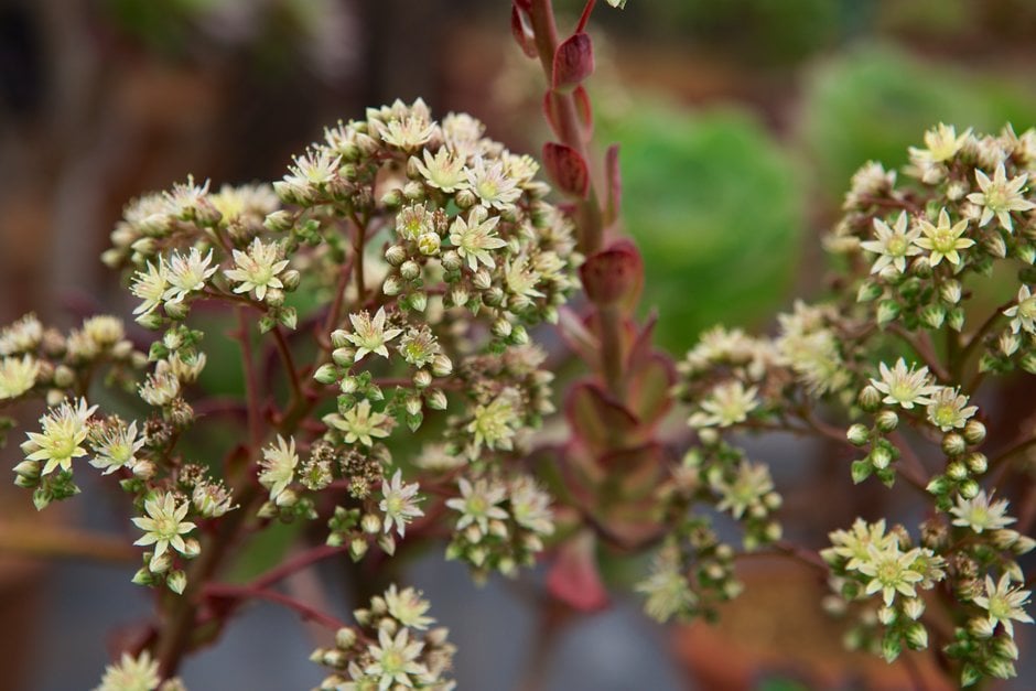 Aeonium are evergreen succulents often of shrubby habit, with fleshy leaves in terminal rosettes on the shoots, and racemes or panicles of small, star-shaped flowers with numerous narrow petals