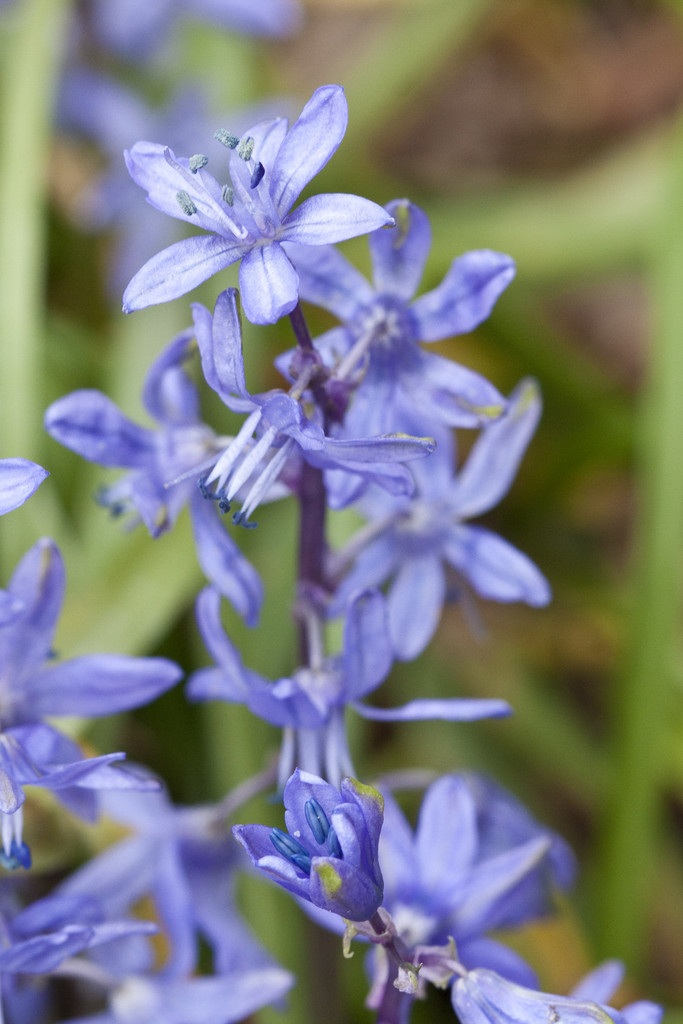 Scilla are perennial bulbs with narrow basal leaves and erect stems bearing racemes of star-shaped, flat or bell-shaped flowers which are often blue