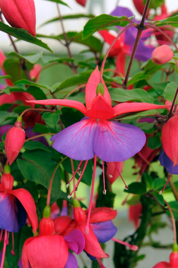 Fuchsia can be deciduous or evergreen shrubs or trees, rarely perennials, with opposite or whorled leaves and usually pendent flowers with conspicuous tubular calyx, 4 spreading sepals and 4 erect petals