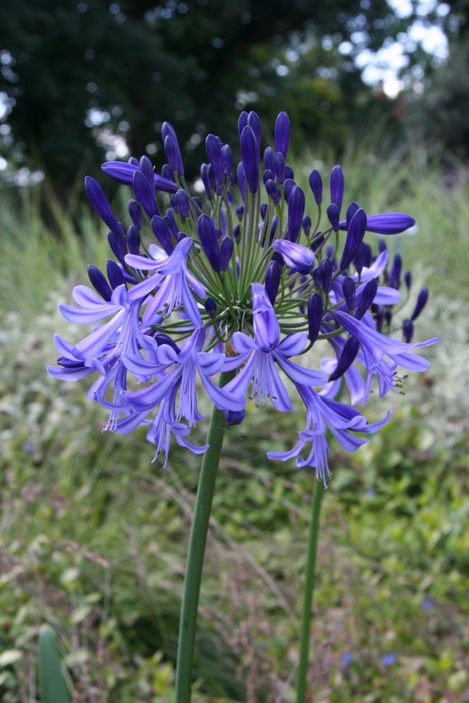 Agapanthus are clump-forming perennials with narrowly strap-shaped leaves, evergreen in some species, and erect stems bearing umbels of funnel-shaped blue or white flowers
