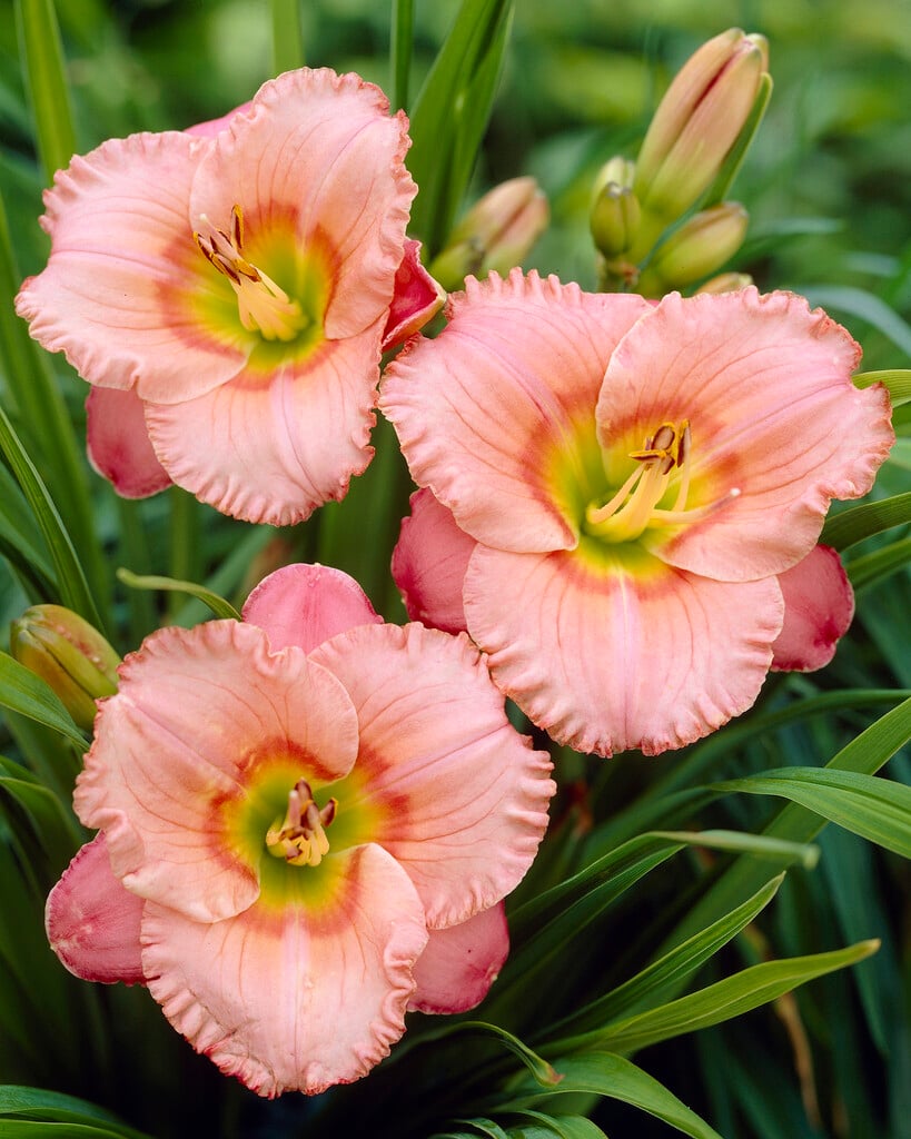 Hemerocallis may be evergreen or herbaceous perennials, with narrow, strap-shaped leaves and funnel-shaped flowers on erect stems in late spring or early summer