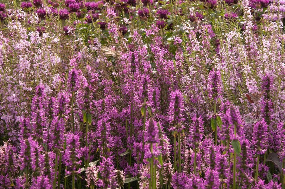 Stachys can be annuals, perennials or shrubs, with paired leaves which are sometimes unpleasantly aromatic, and erect spikes or racemes of whorled, 2-lipped flowers