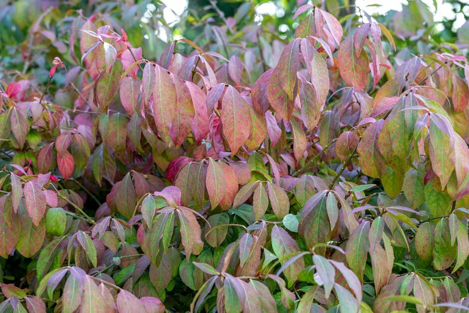 Euonymus can be deciduous or evergreen shrubs or small trees, often with fine autumn colour, and small flowers followed by colourful fruits