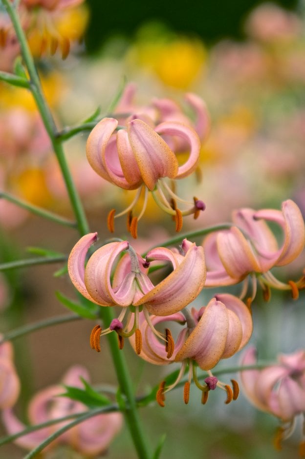 Lilium are bulbous perennials with erect stems bearing whorled or spirally arranged leaves and terminal racemes or umbels of bowl-shaped, trumpet-shaped, funnel-shaped or turks cap shaped flowers, often fragrant, and white, yellow, orange or red