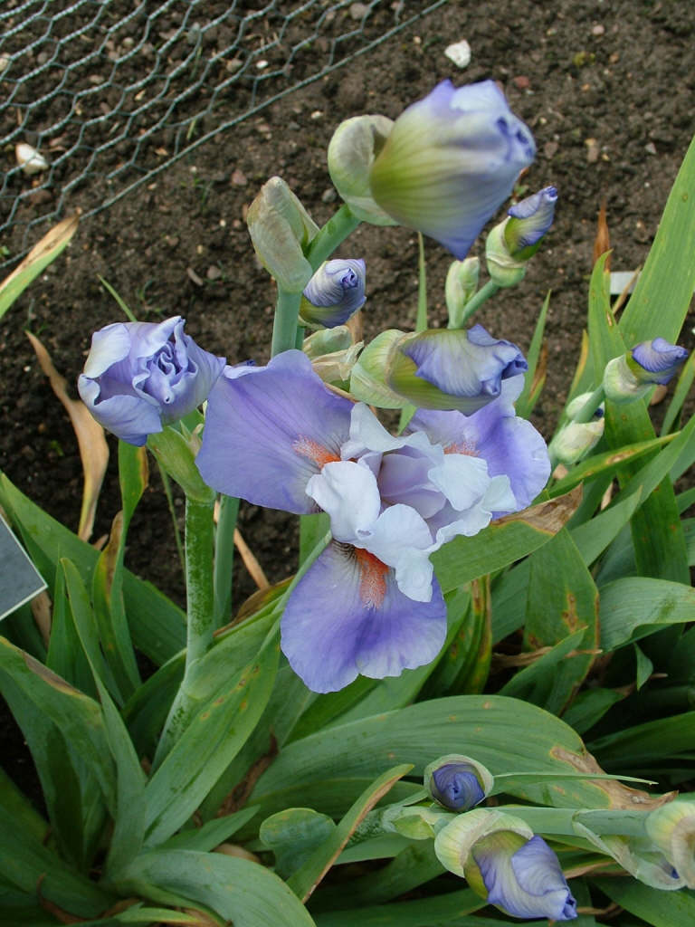 A deciduous perennial with sword-like grey-green leaves and pale violet-blue flowers with paler standards, and orange beard on the falls